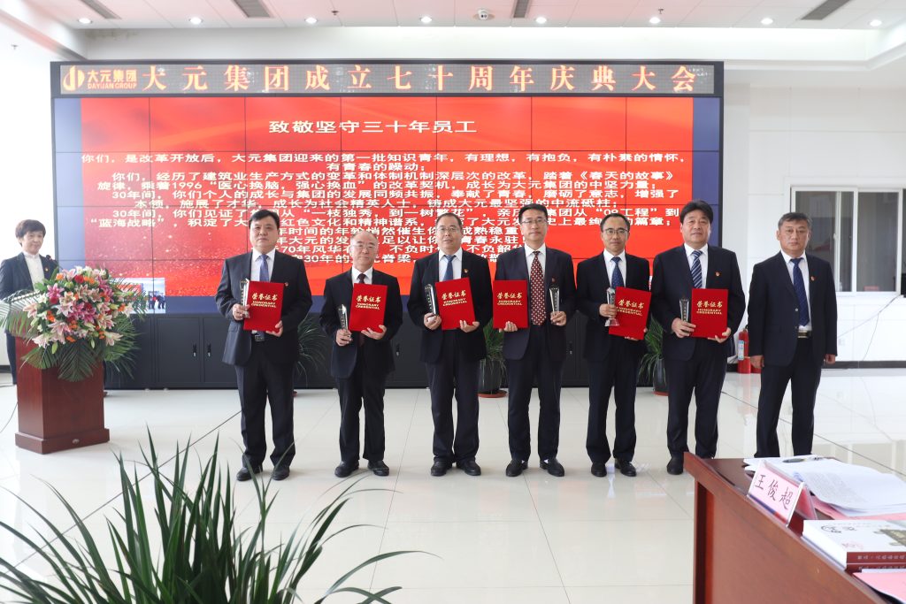 元正文旅集團董事長張容強(25周年)、總承包公司總經理吳振棟(25周年)、路橋公司總經理孫紅閣(24周年)、大元集團黨委副書記于宙(24周年)、九公司總經理金廣振(23周年)、元中建設總經理張萬成(21周年)。“2052青年軍”政委齊平安(大元集團人力資源、綜合管理中心總監)為其頒獎。