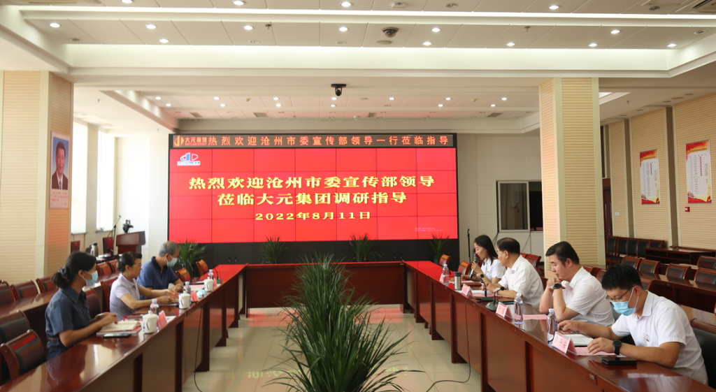 8月11日上午,滄州市委宣傳部三級調研員李芬、政研會秘書長李增會、政研會曹一凡蒞臨大元集團就思想建設、文化建設等方面進行調研指導,大元集團黨委書記、董事局主席李建國、黨委副書記于宙、總部黨支部書記、黨群文化中心總監王金英、人力資源管理中心、綜合管理中心總監齊平安熱情接待并參加座談。總部黨支部書記、黨群文化中心總監王金英主持會議。